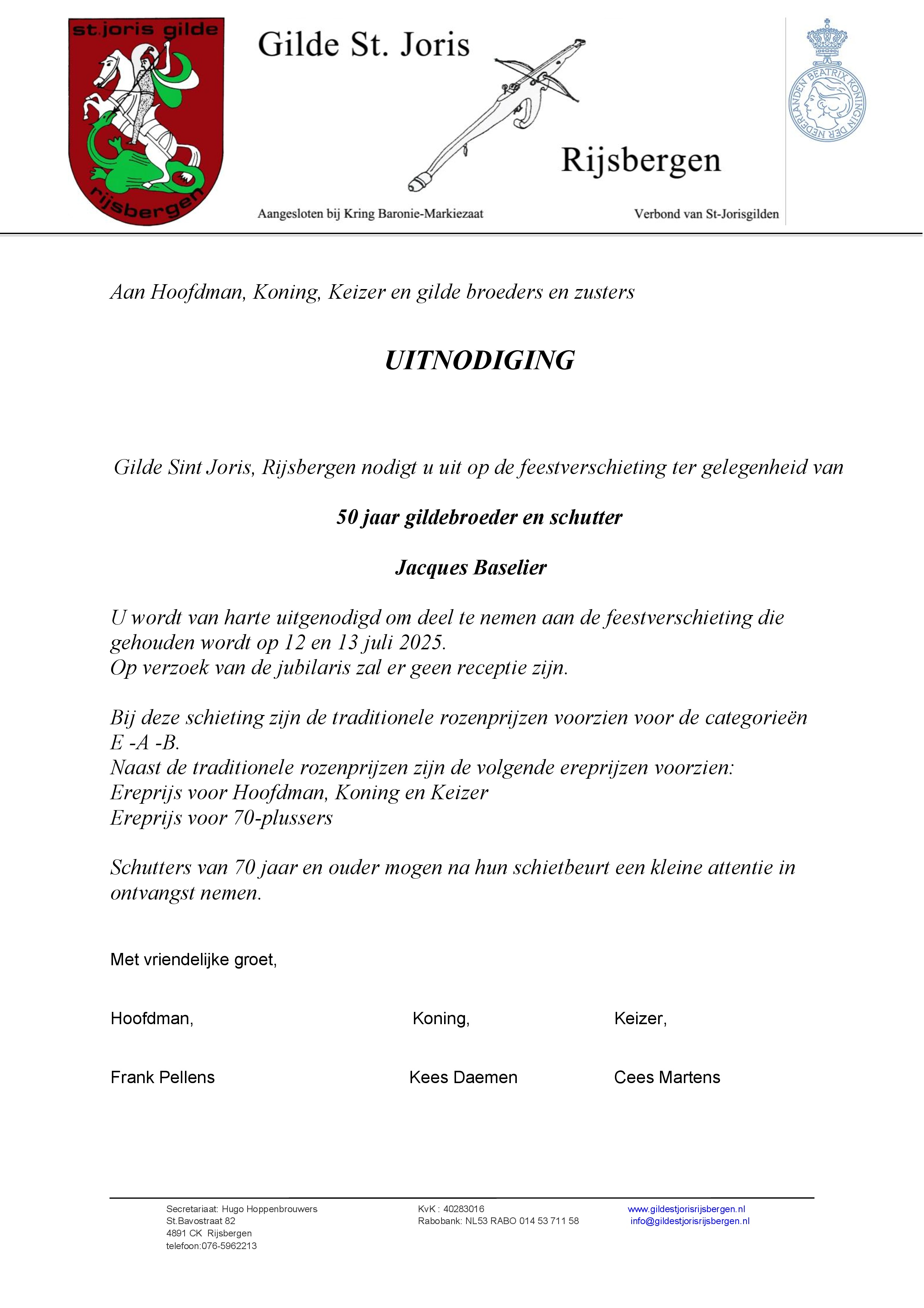 Als bijlage de uitnodiging voor de feestverschieting ter ere van Jacques Baselier op 12 en 13 juli 2025: