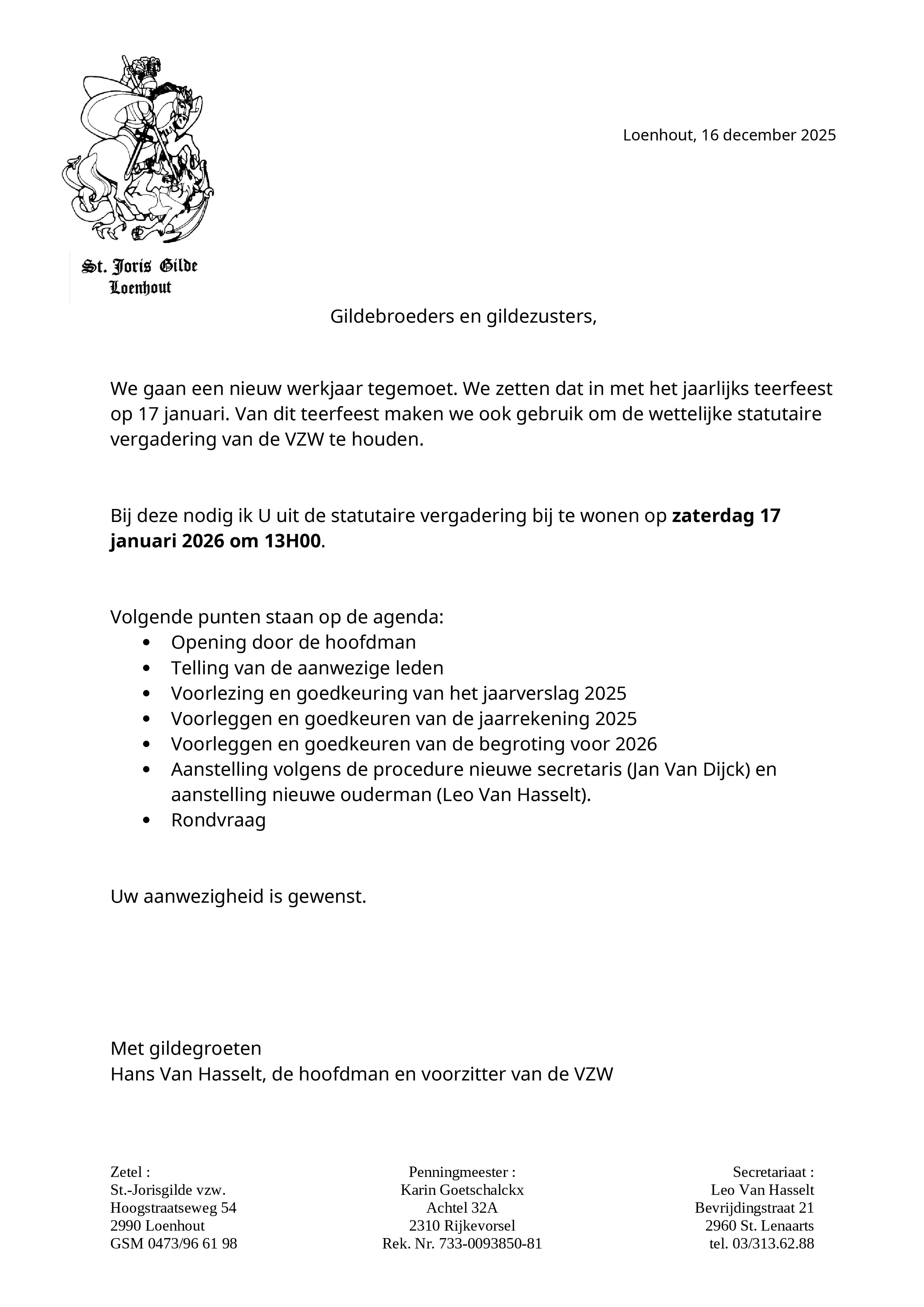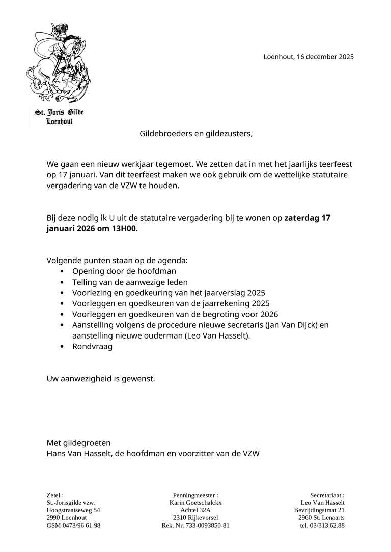 In bijlage vind je een algemene uitnodiging + een uitnodiging voor de statutaire vergadering. Lees dit even aandachtig en vergeet niet inĀ te schrijven.