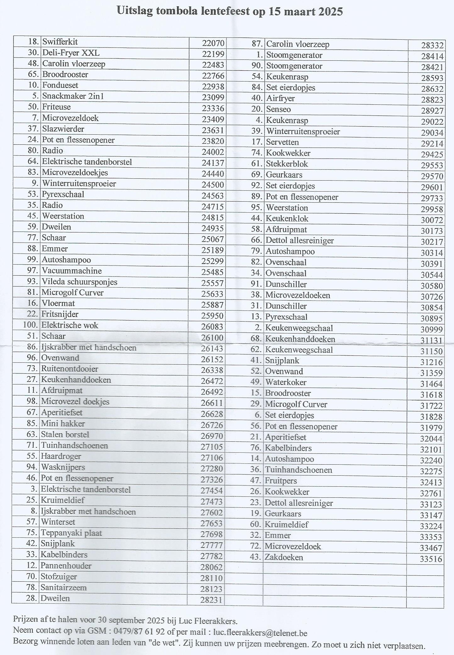 In bijlage de uitslag van de tombola van het lentefeest van 15 maart ll.
