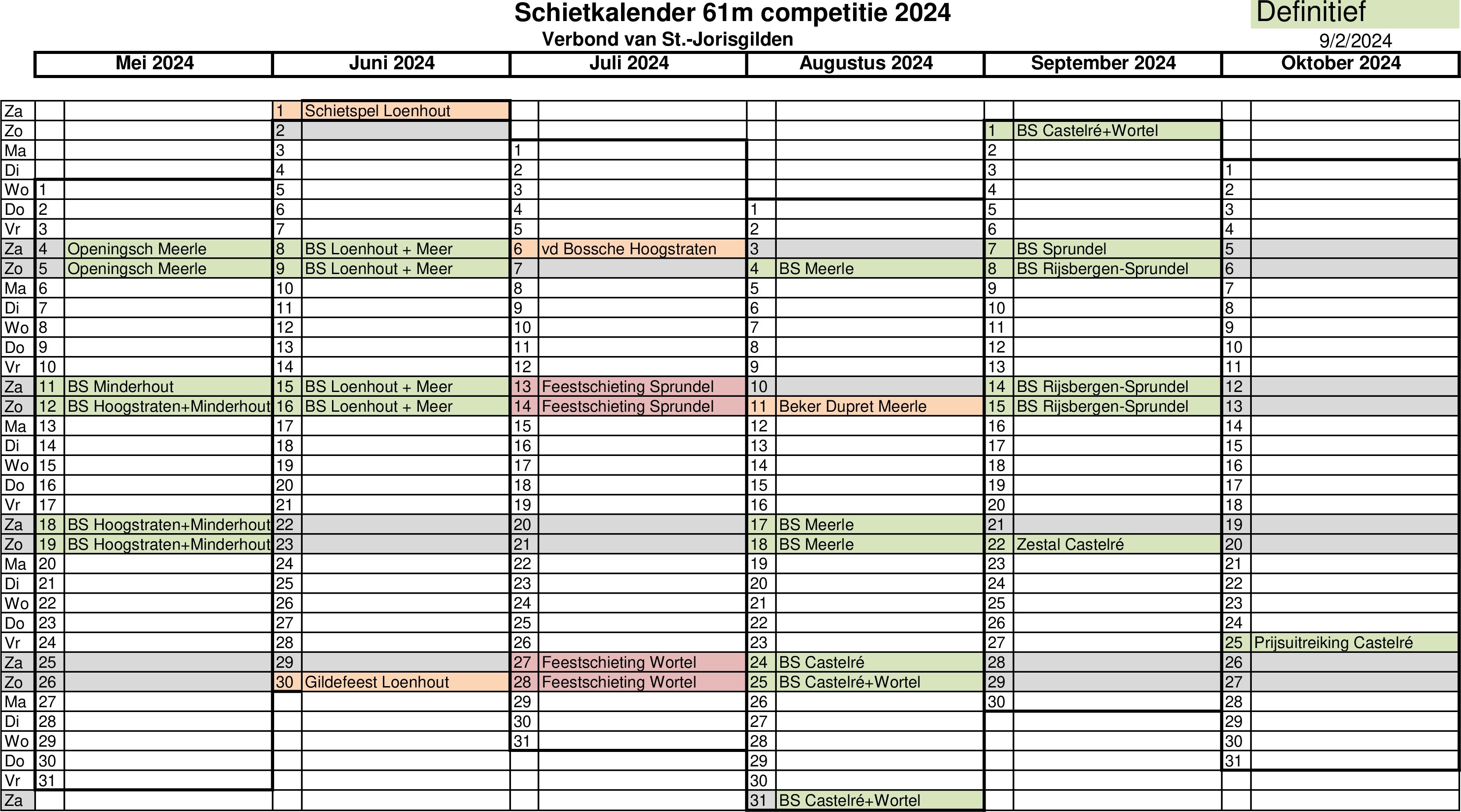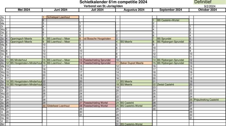 Schietspel op zaterdag 1 juni, bondschieting 8 + 9 en 15 + 16 juni, schieting van het gildefeest op zondag 30 juni.